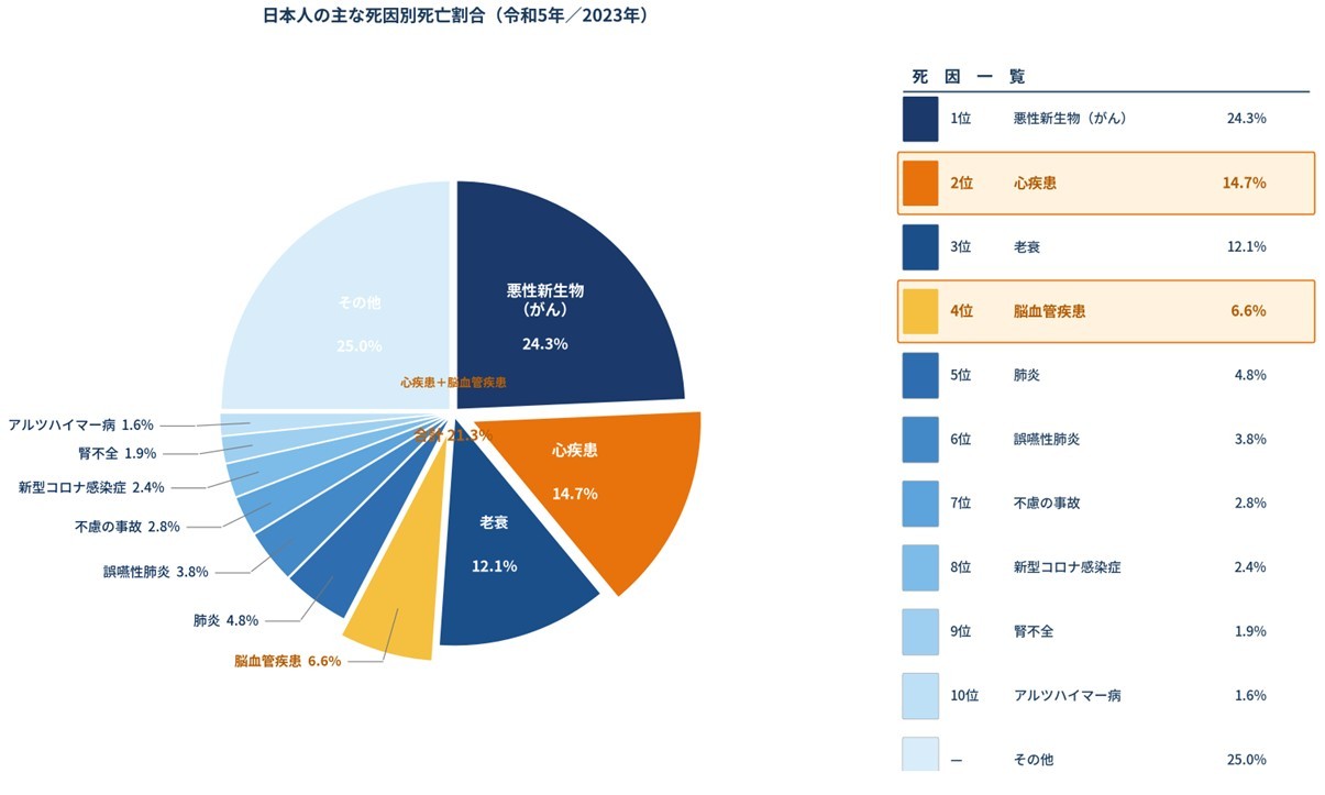 令和5年(2023年)の統計によると、日本人の死亡原因の第1位は悪性新生物(がん)(24.3%)、第2位は心疾患(14.7%)、第3位は老衰(12.1%)、第4位は脳血管疾患(6.6%)となっています。